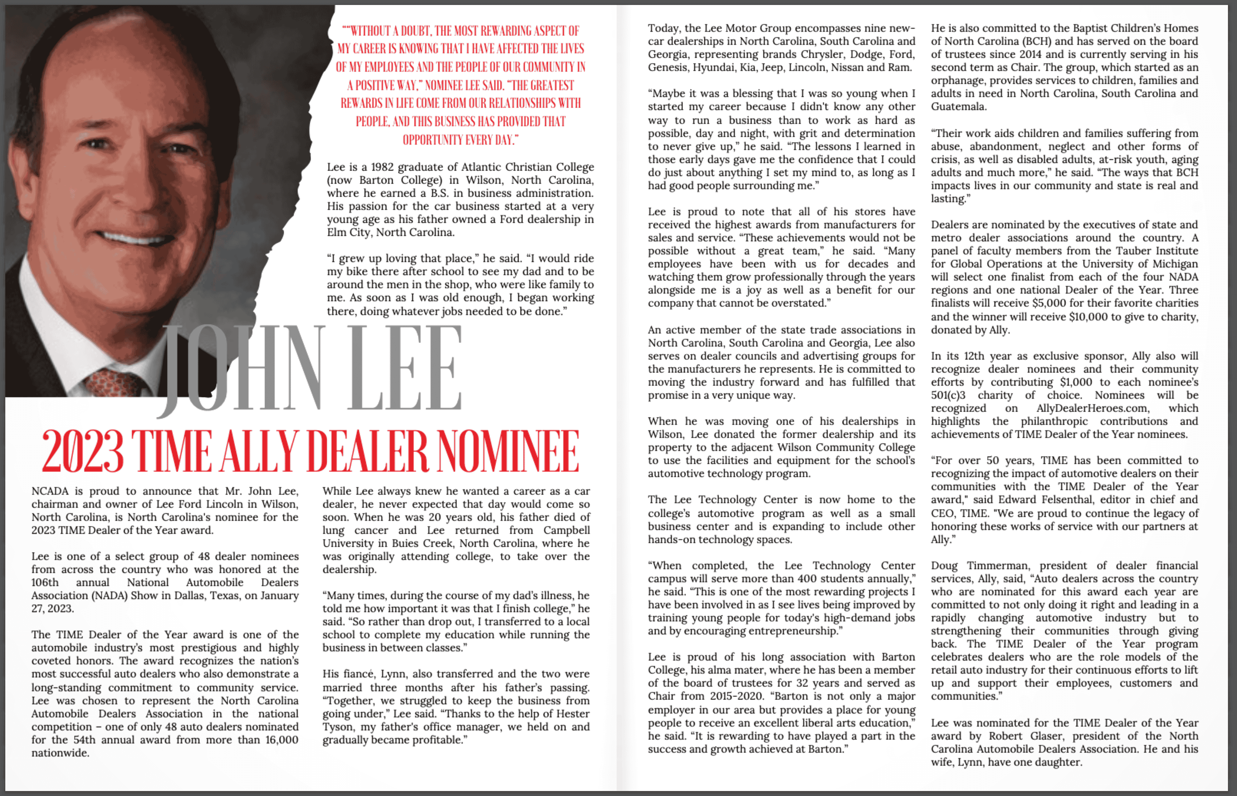 John Lee was named the TIME Ally Dealer of the Year for North Carolina in 2023, making him North Carolina’s nominee for the national award. This award is given to the most successful automotive dealers who are also dedicated to community service and supporting the industry. Lee was one of a select group of nominated dealers who were honored at the National Automobile Dealers Association Show in January 2023.